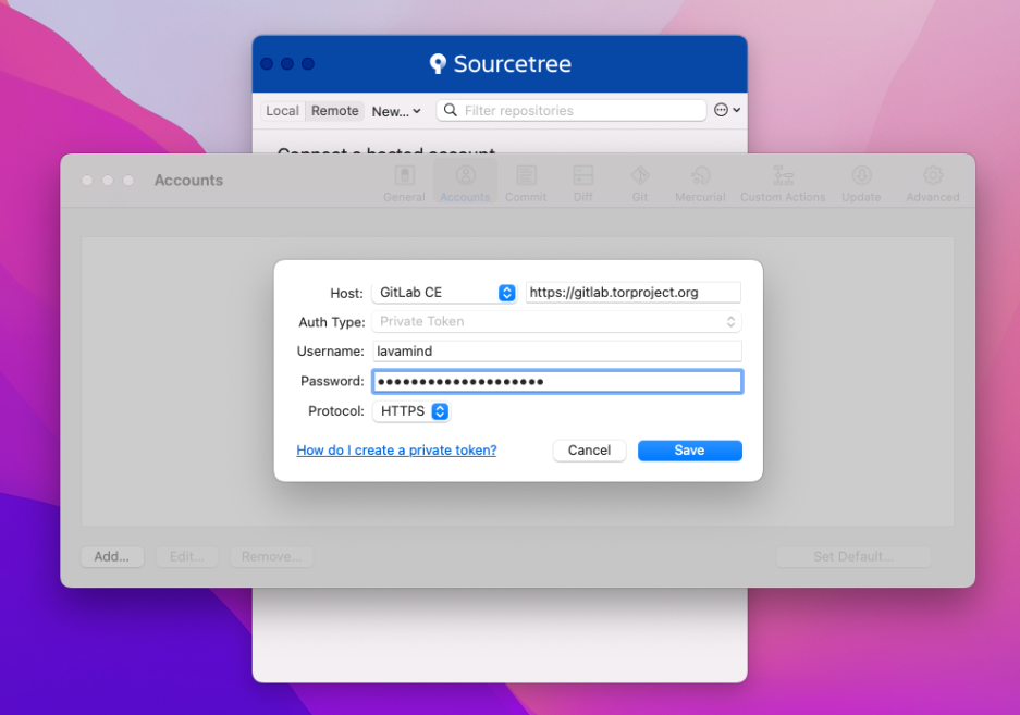 Now, open Sourcetree and click the Connect... button on the main windows, then Add..., and fill in the dialog as below. Paste the token in the Password field.