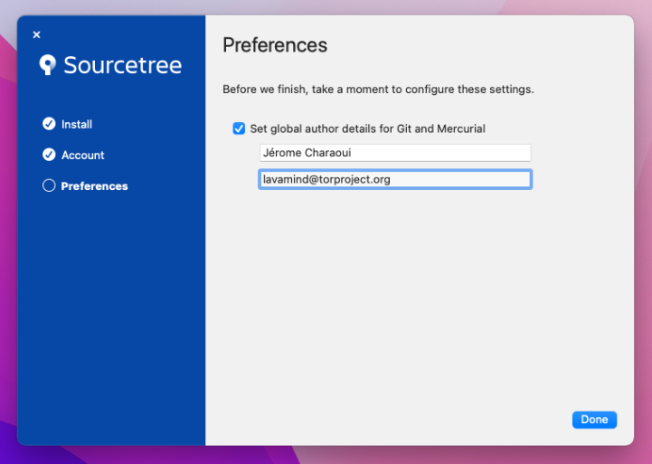 Follow the installer prompts, entering name and email address so that the git commits are created with adequate identifying information.