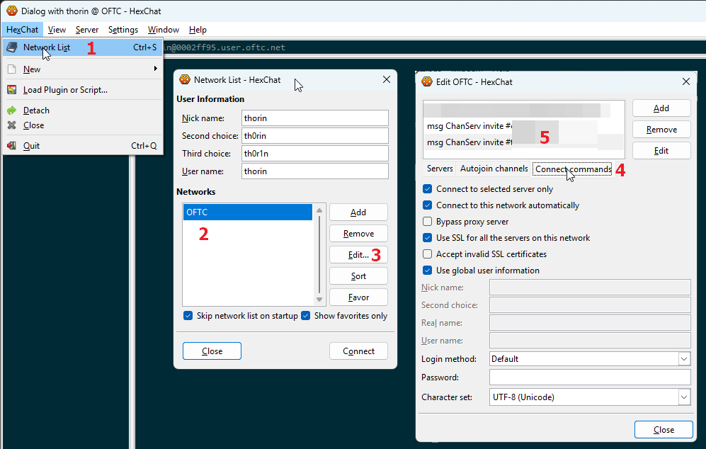 This screenshot shows where to click, in sequence, to configure HexChat to send the right commands when connecting.